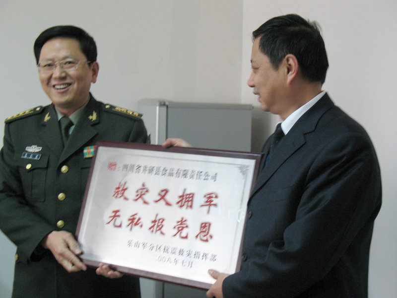 2月19日上午,中共乐山军分区政委朱代贵一行来到蓝雁集团,向蓝雁集团在“5.12”抗震救灾期间奉献的巨大爱心和对人民子弟兵的关怀表示感谢,并赠给井研食品公司“救灾又拥军、无私报党恩”的荣誉。